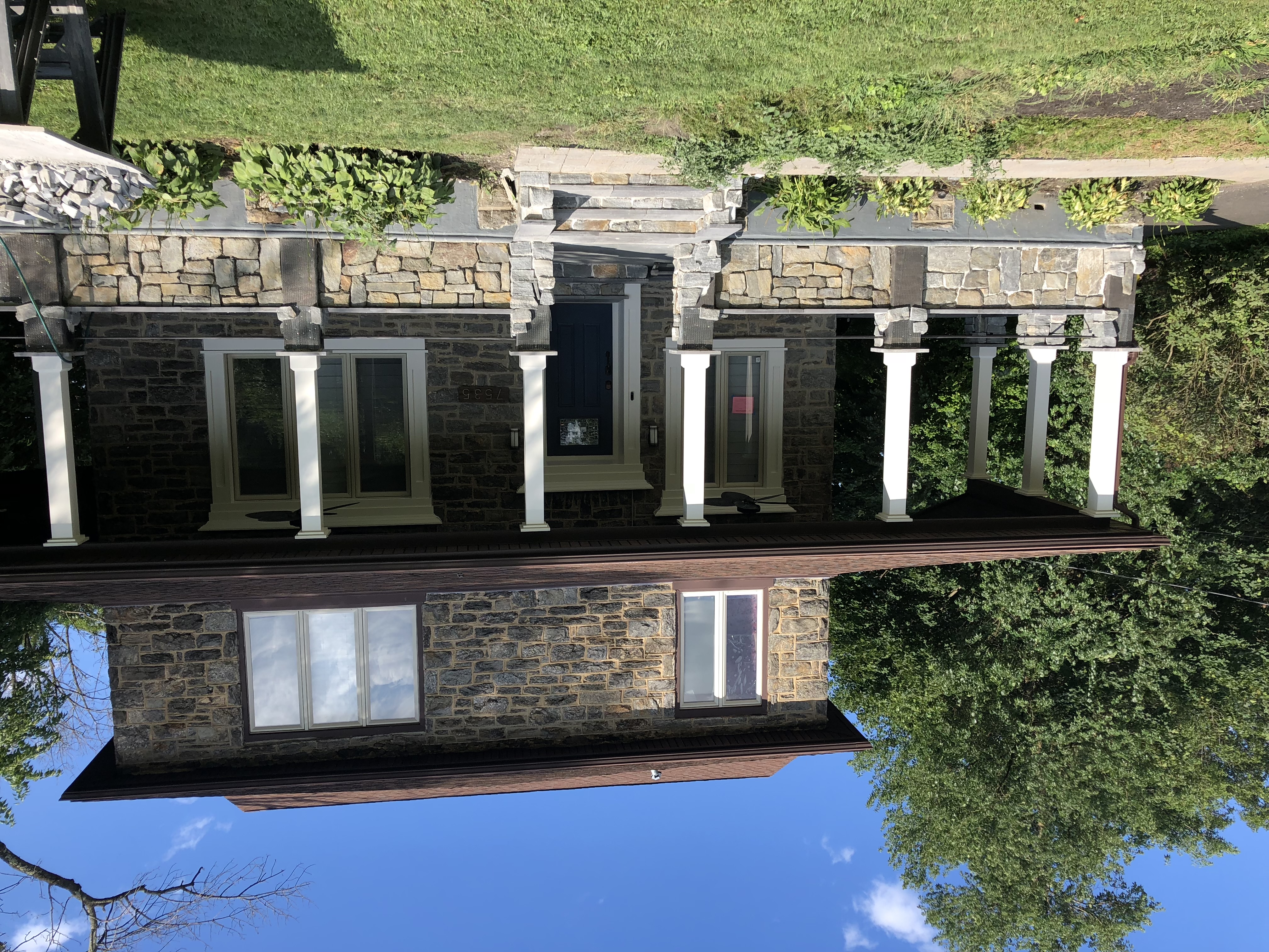 The Levy home at 1895-era Wissahickon stone sits quietly on Mill Road in Elkins Park, Pennsylvania. From the street, it reads as a classic colonial: aged stone, a deep blue front door with an antique bronze mail slot, original stone pillars at the driveway entrance, and a wraparound porch that belongs to another century. What waits inside is something else entirely.