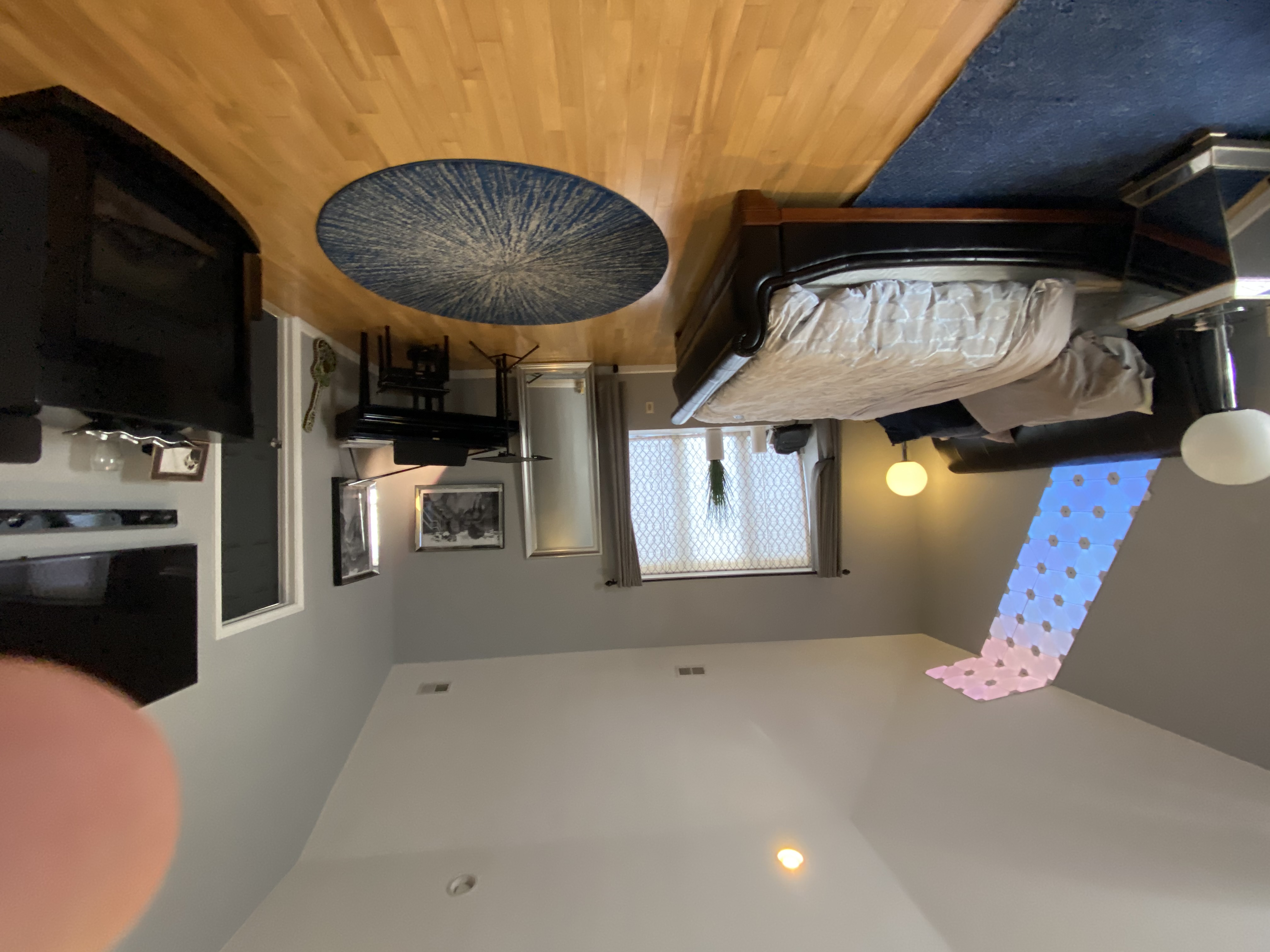 The largest room in the house, with 14-foot ceilings and the feeling of a suite in a very personal hotel. A Wyoming king-sized bed beneath sixty Nanoleaf light panels that climb the walls and ceiling. Mirrored-glass nightstands. A black fireplace. A Yamaha Clavinova in one corner. The ensuite: a jacuzzi tub, shower stall, Brondell bidet, and a towel warmer for winter mornings.