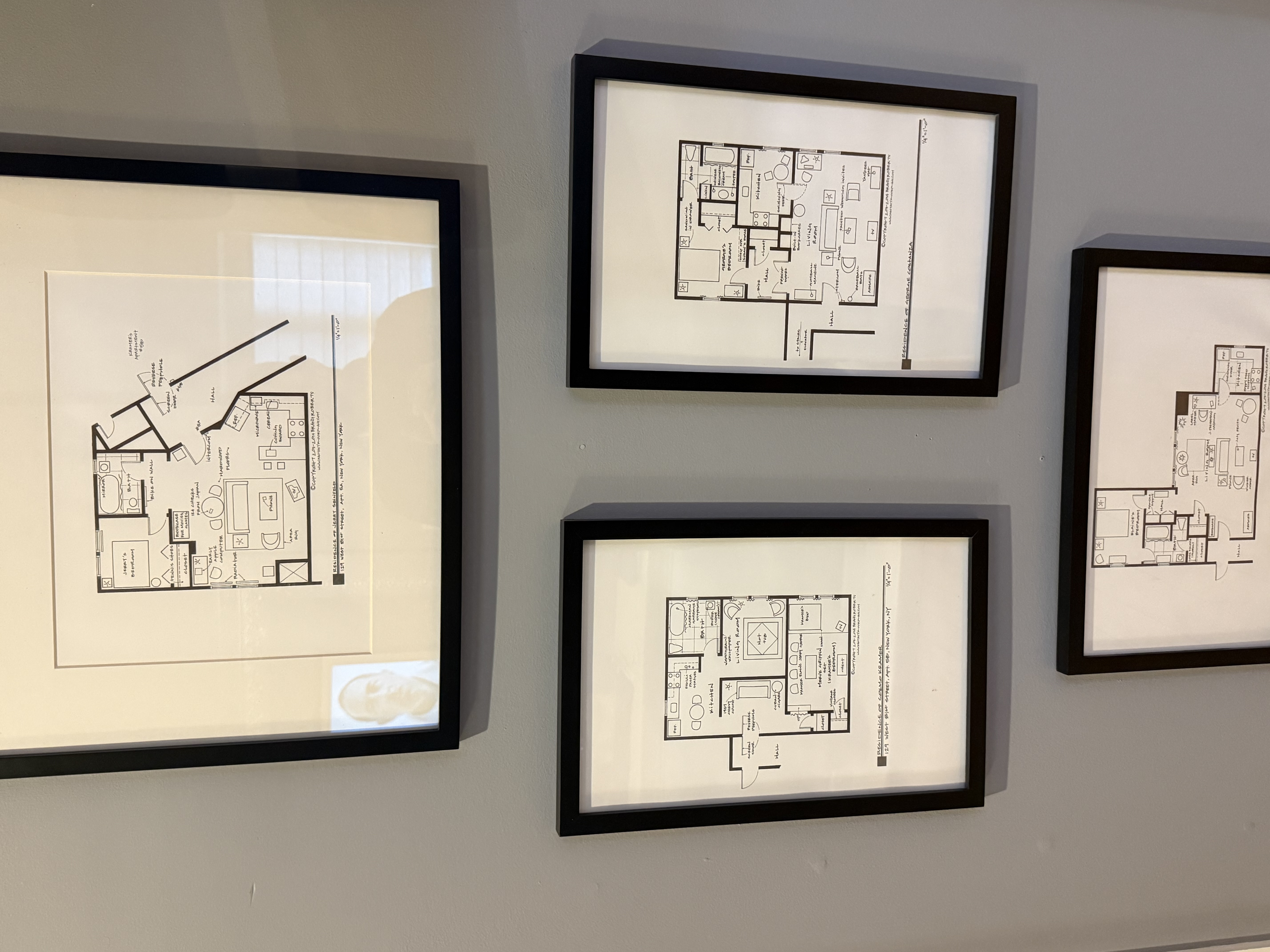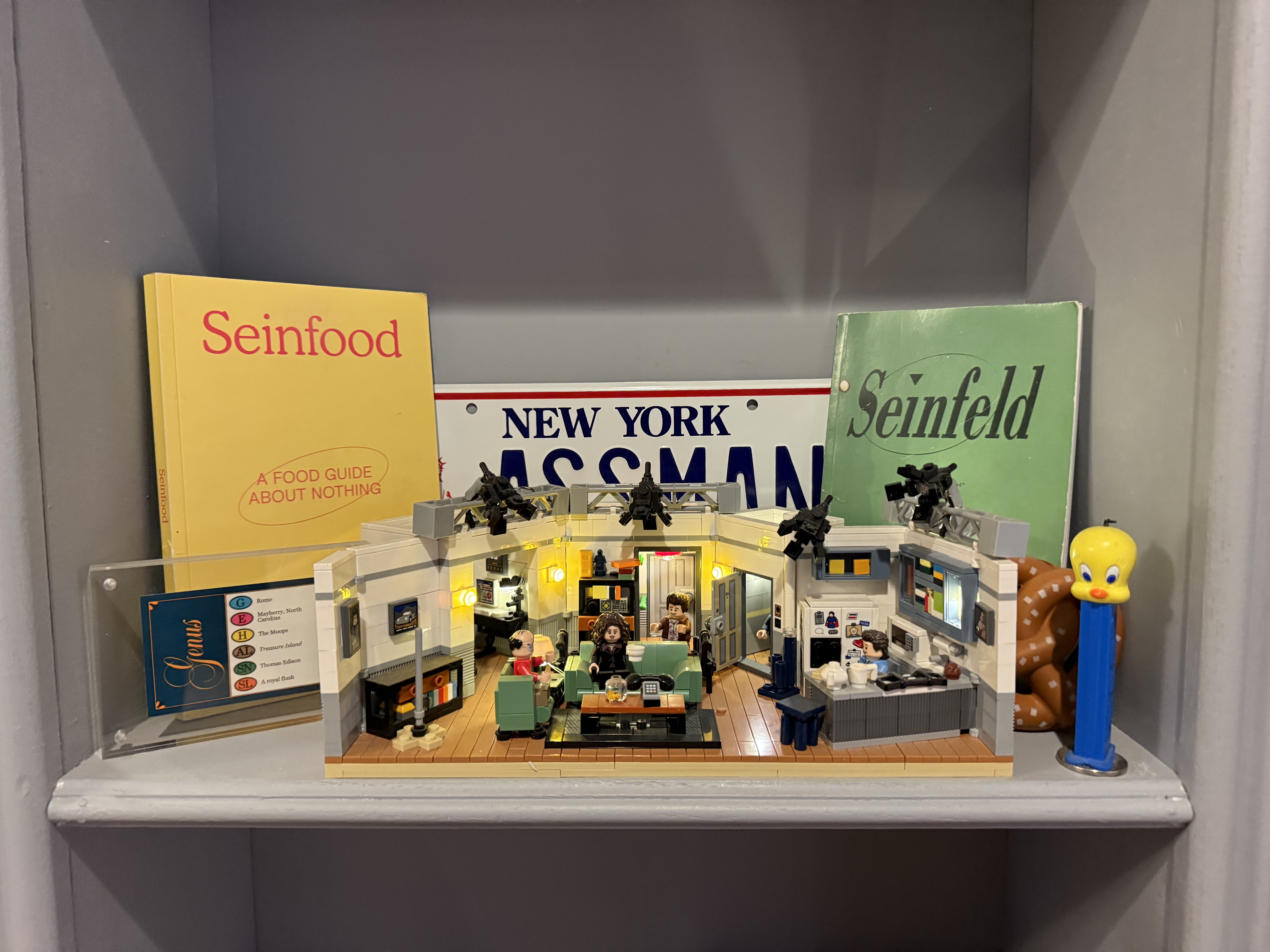 It begins at the front door, where the Meural digital canvas cycles through Seinfeld fan art. It continues inside the secret bathroom: the ASSMAN license plate, the Tweety Bird Pez dispenser, the custom Trivial Pursuit card with the Moops answer, the script from The Big Salad, a LEGO recreation of Jerry's apartment, and the door soundbox that plays the bass line as you leave.