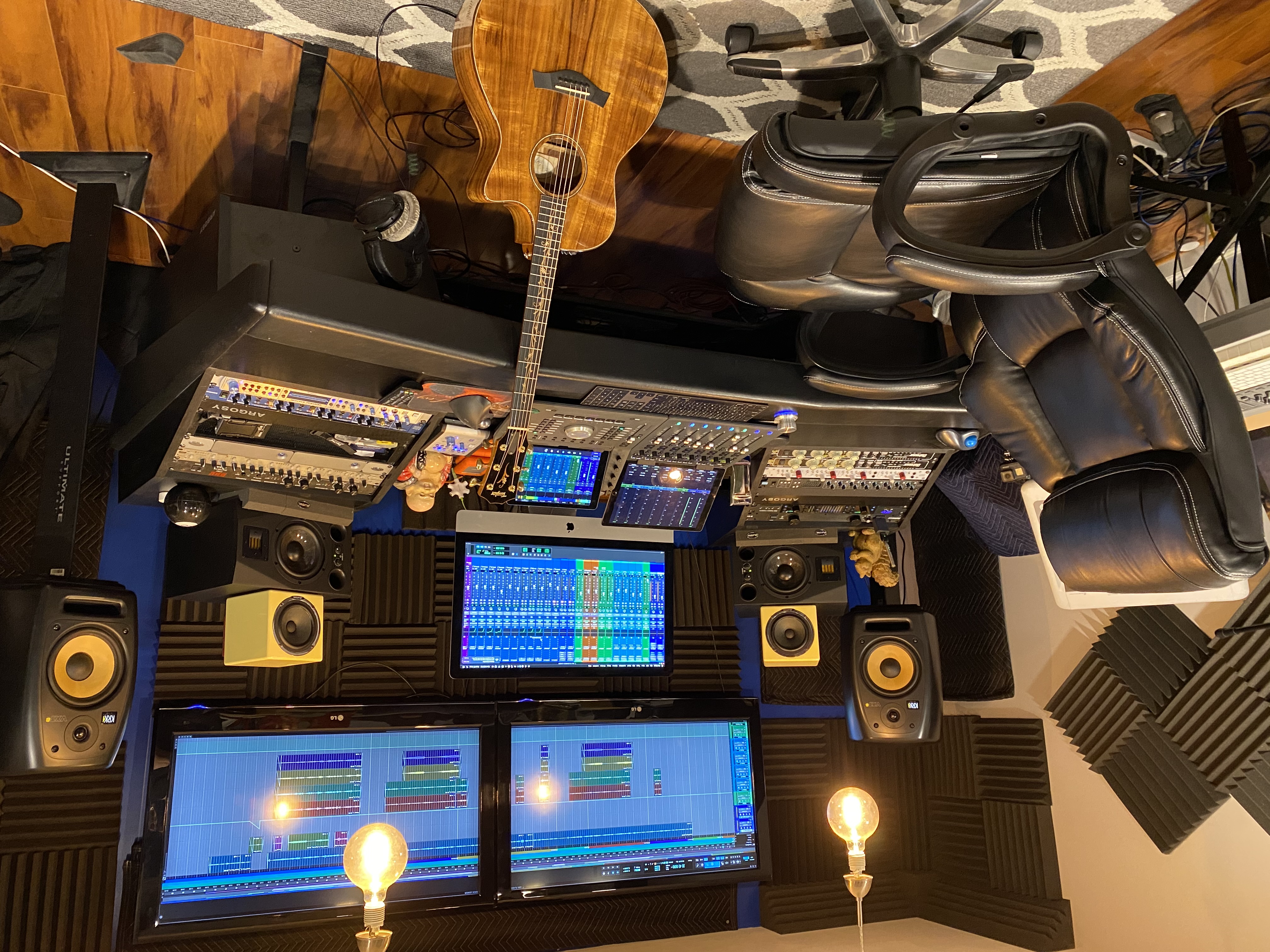 The studio houses dozens of guitars and stringed instruments, rare microphones, soundproofing panels, a Yamaha Clavinova, and an Argosy desk running an Apple iMac i9. It sits beneath a vent in the living room floor — so when Ross is working on an album, the family upstairs can hear every repeated line, every revision, every take.