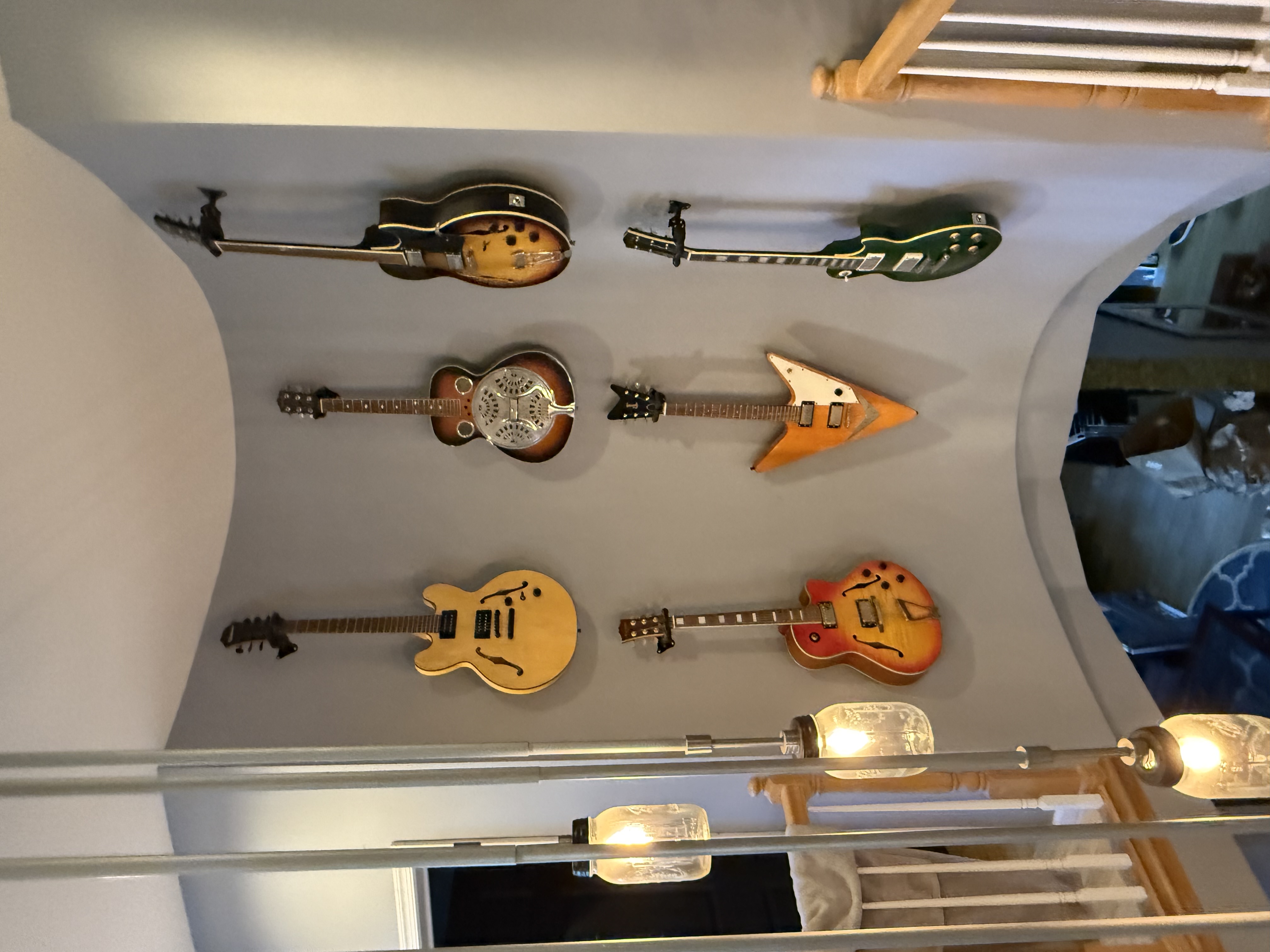 Standing beneath the mason jar chandelier — a dramatic spiral of steel and hand-blown jars fitted with flame-tipped bulbs — you are at the literal and symbolic center of the main level. Six acoustic guitars hang overhead in the main foyer. A 12-foot by 5-foot Jackson Pollock-style painting — gold, silver, white, and black — titled Sporadic Gold, created by Ross himself, spans the wall between the main level and playroom.