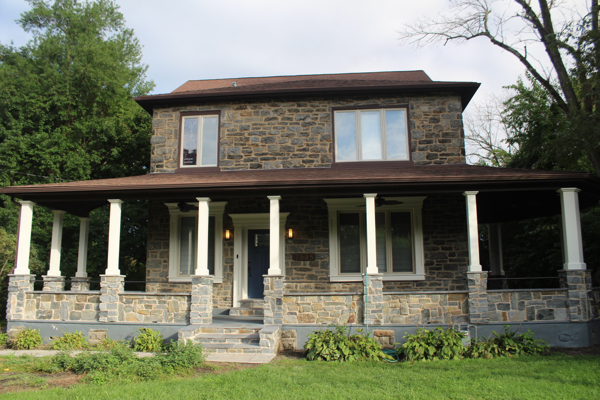 The Levy home at 1895-era Wissahickon stone sits quietly on Mill Road in Elkins Park, Pennsylvania. From the street, it reads as a classic colonial: aged stone, a deep blue front door with an antique bronze mail slot, original stone pillars at the driveway entrance, and a wraparound porch that belongs to another century. What waits inside is something else entirely.