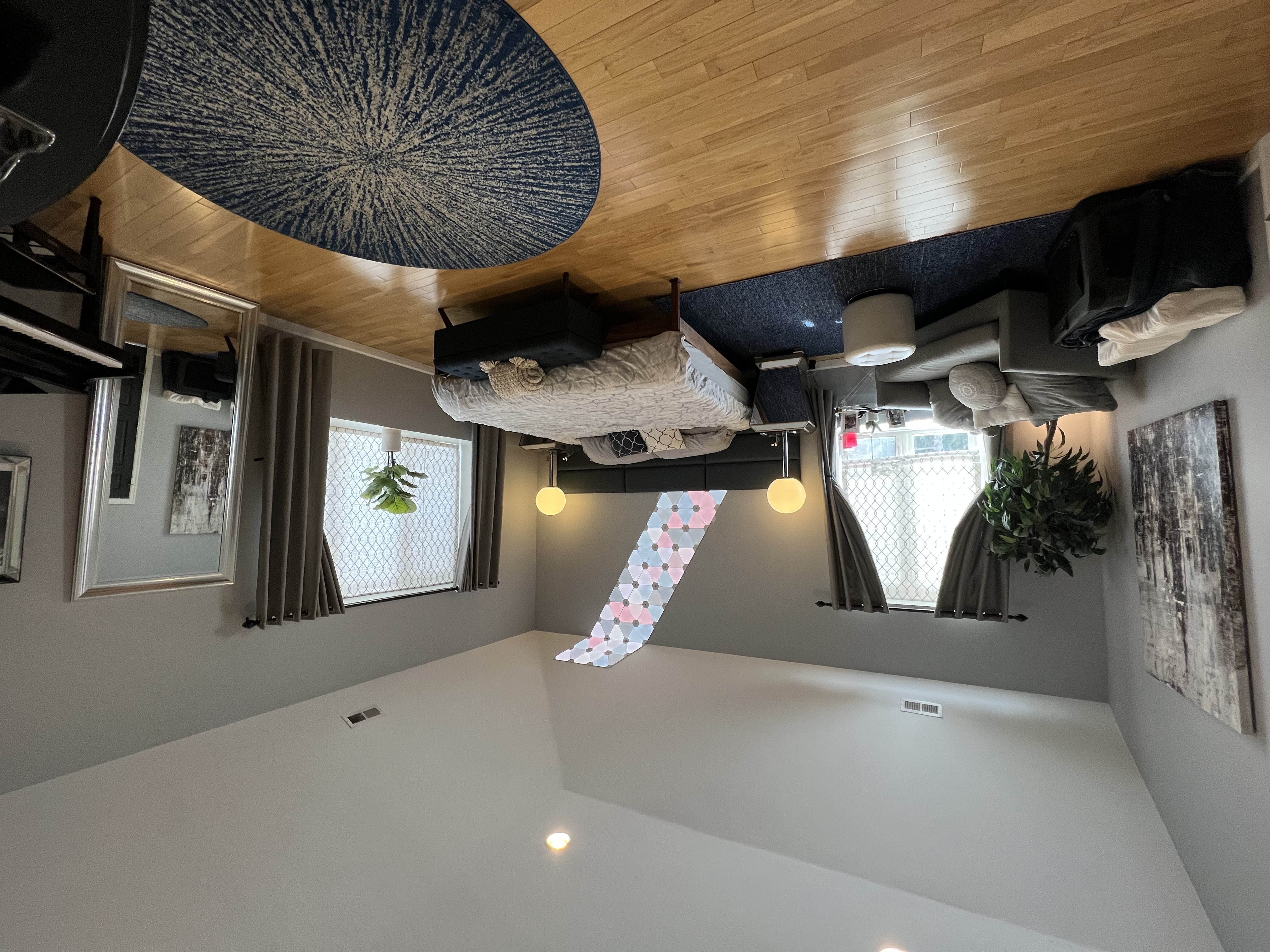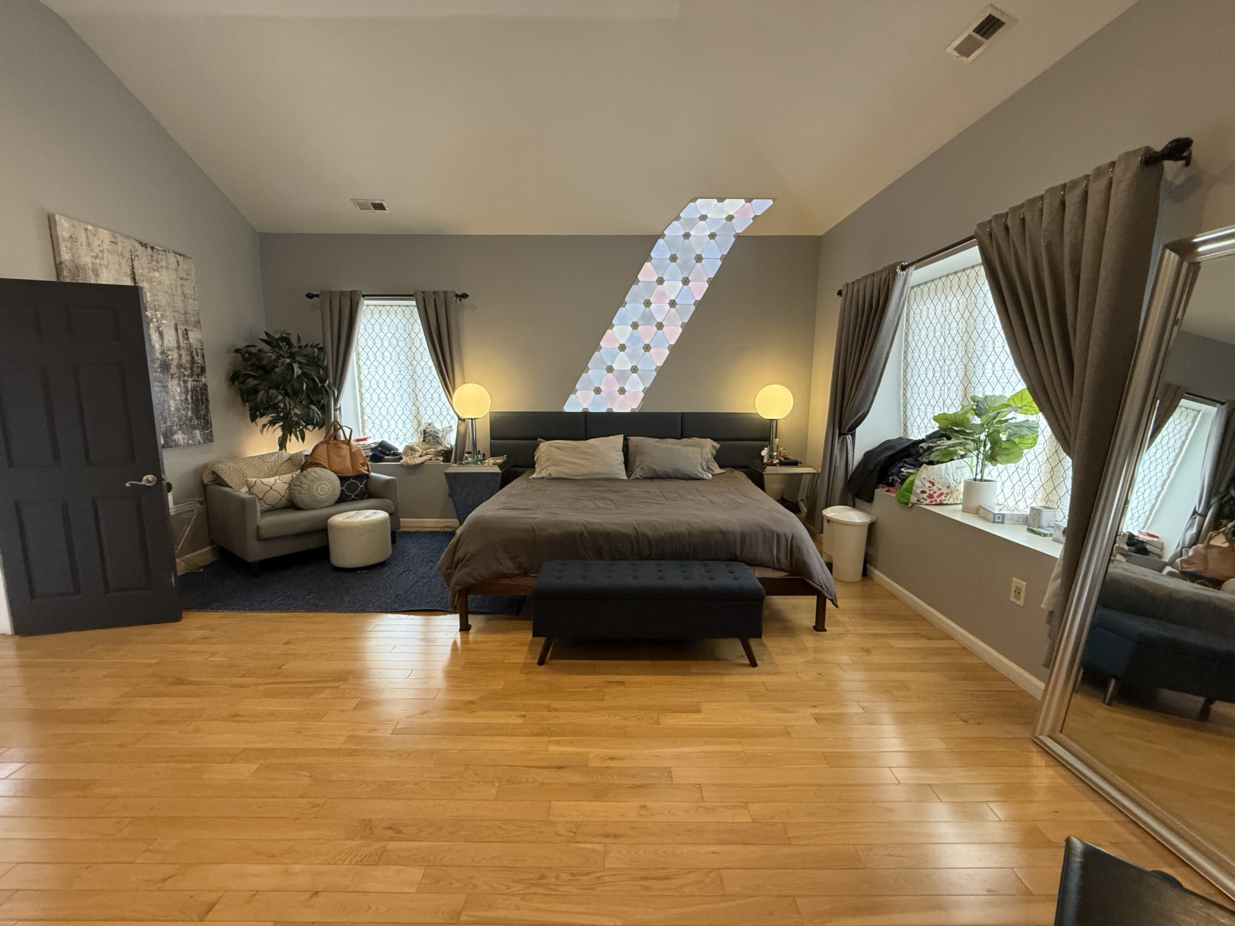 The largest room in the house, with 14-foot ceilings and the feeling of a suite in a very personal hotel. A Wyoming king-sized bed beneath sixty Nanoleaf light panels that climb the walls and ceiling. Mirrored-glass nightstands. A black fireplace. A Yamaha Clavinova in one corner. The ensuite: a jacuzzi tub, shower stall, Brondell bidet, and a towel warmer for winter mornings.