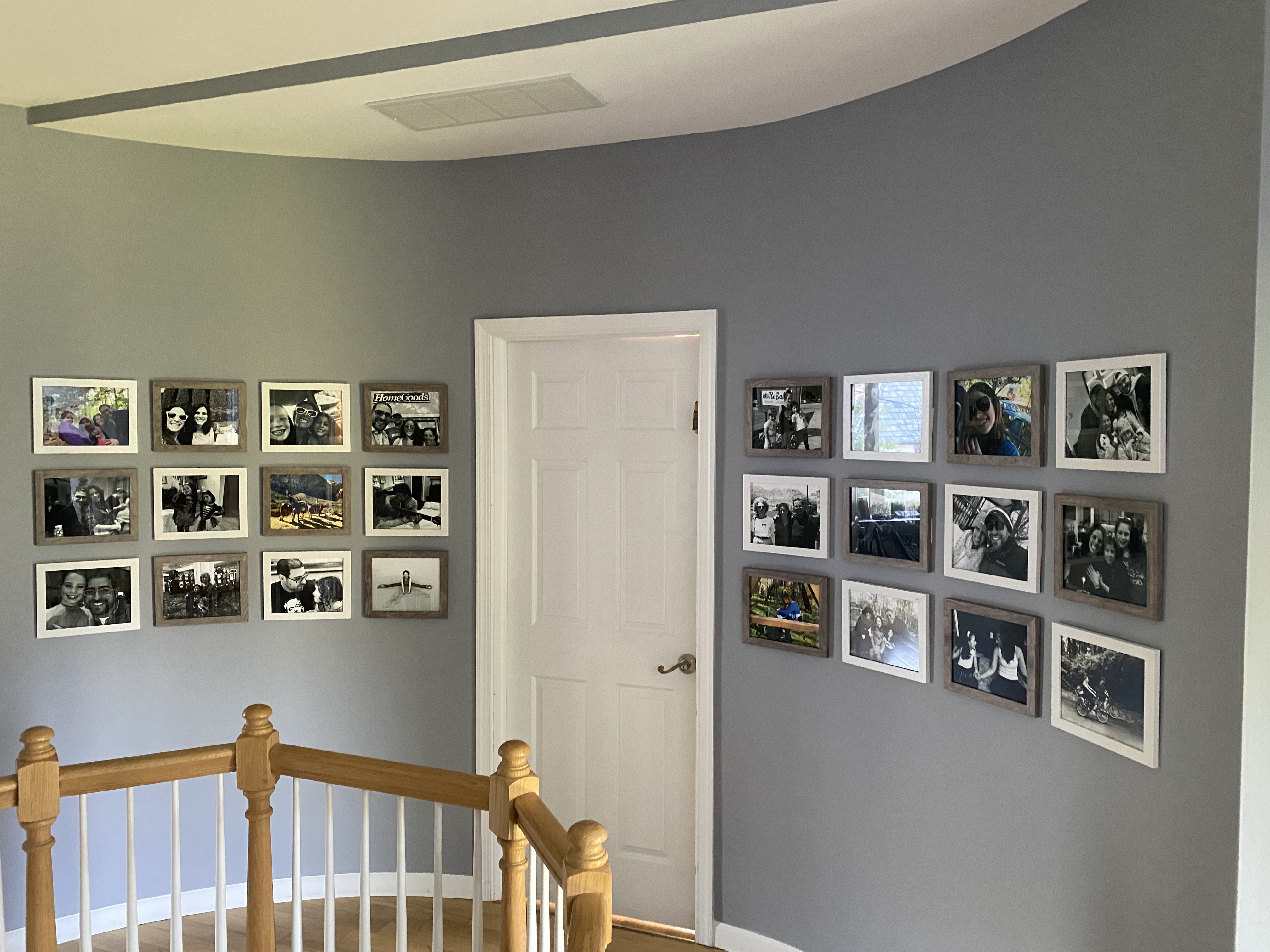 Simple and intentional, with warm Porter Ranch yellow walls. A gallery of 32 black-and-white family photos in matching frames surrounds the doorway — a quiet, tender archive.