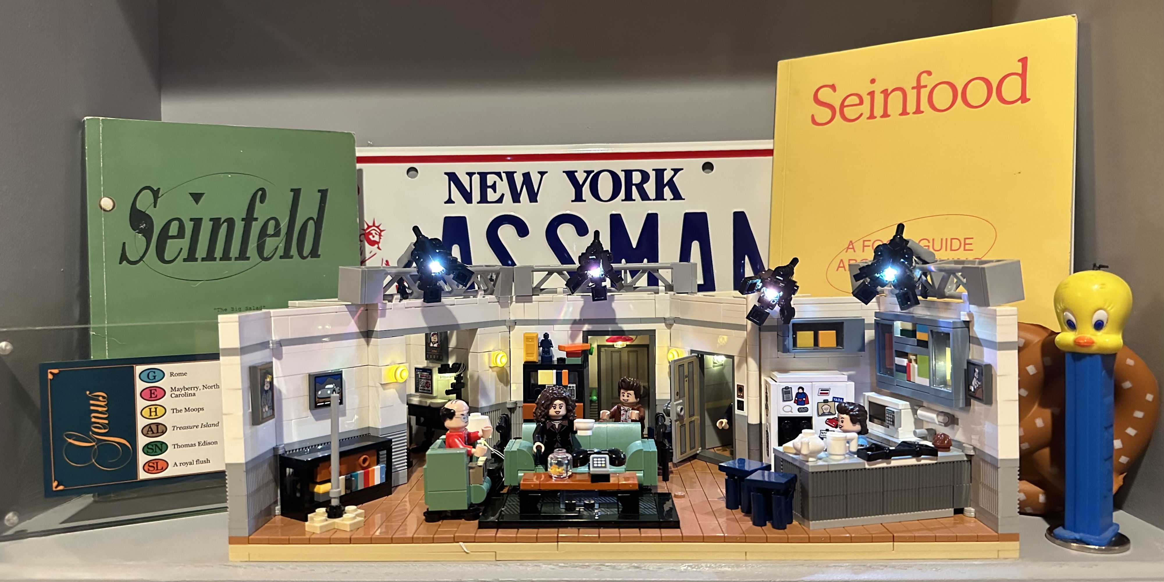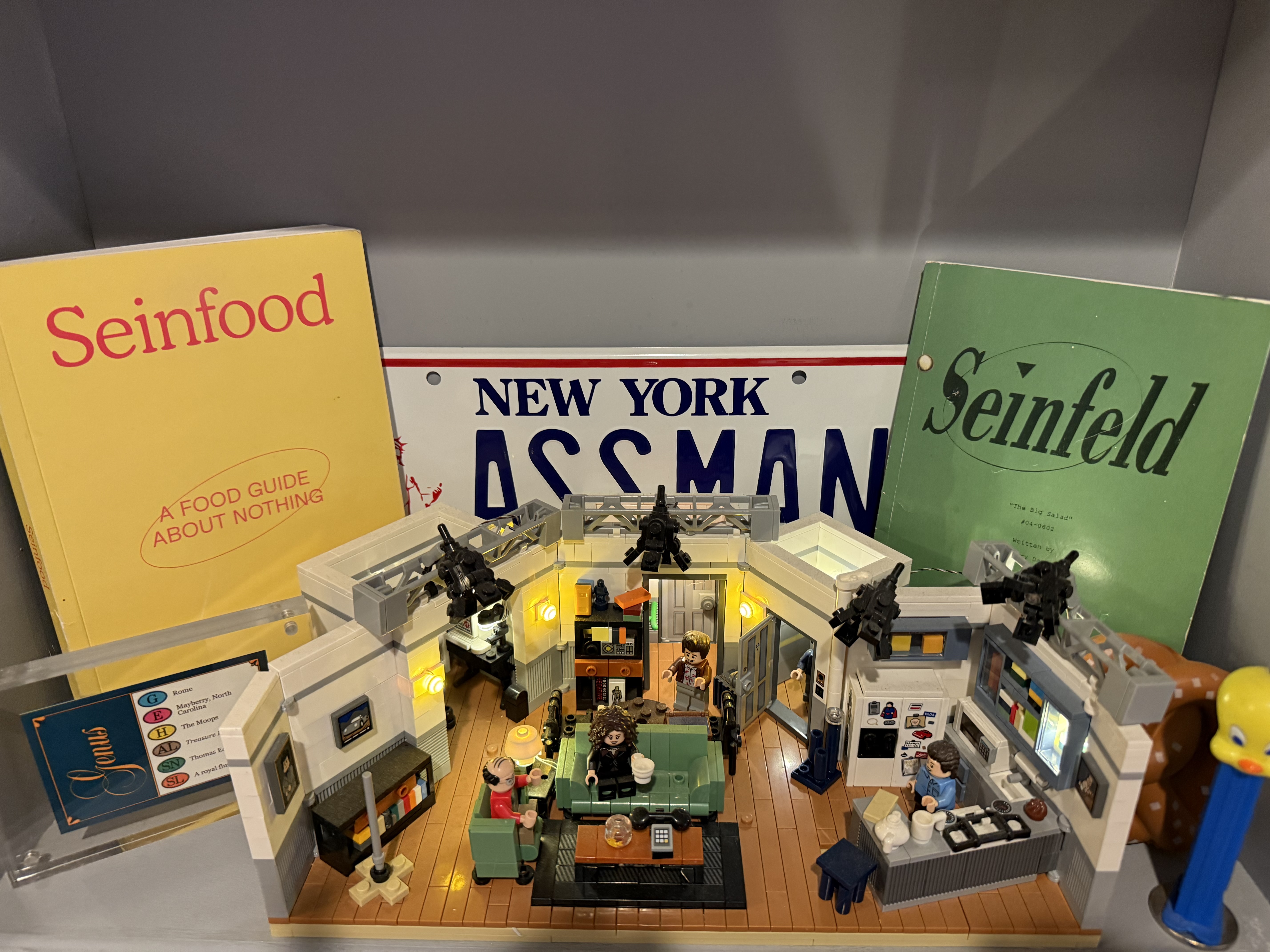 It begins at the front door, where the Meural digital canvas cycles through Seinfeld fan art. It continues inside the secret bathroom: the ASSMAN license plate, the Tweety Bird Pez dispenser, the custom Trivial Pursuit card with the Moops answer, the script from The Big Salad, a LEGO recreation of Jerry's apartment, and the door soundbox that plays the bass line as you leave.