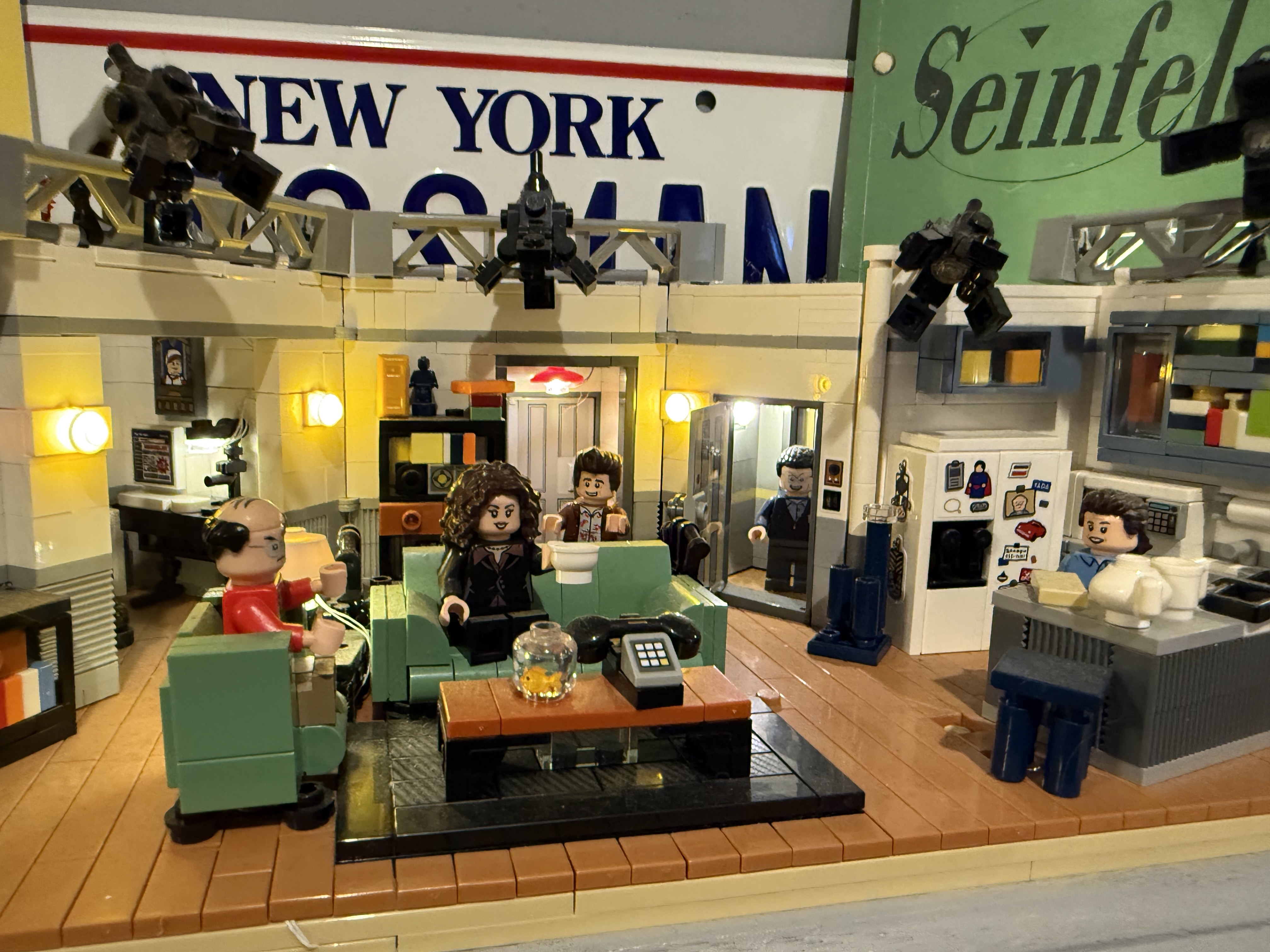 Inside: navy blue with orange accents, a vintage rotary phone, the ASSMAN license plate from Seinfeld, a custom Trivial Pursuit card with the Moops answer, the script from The Big Salad, a LEGO recreation of Jerry's apartment, and a soundbox by the door that plays the Seinfeld bass line when you leave.