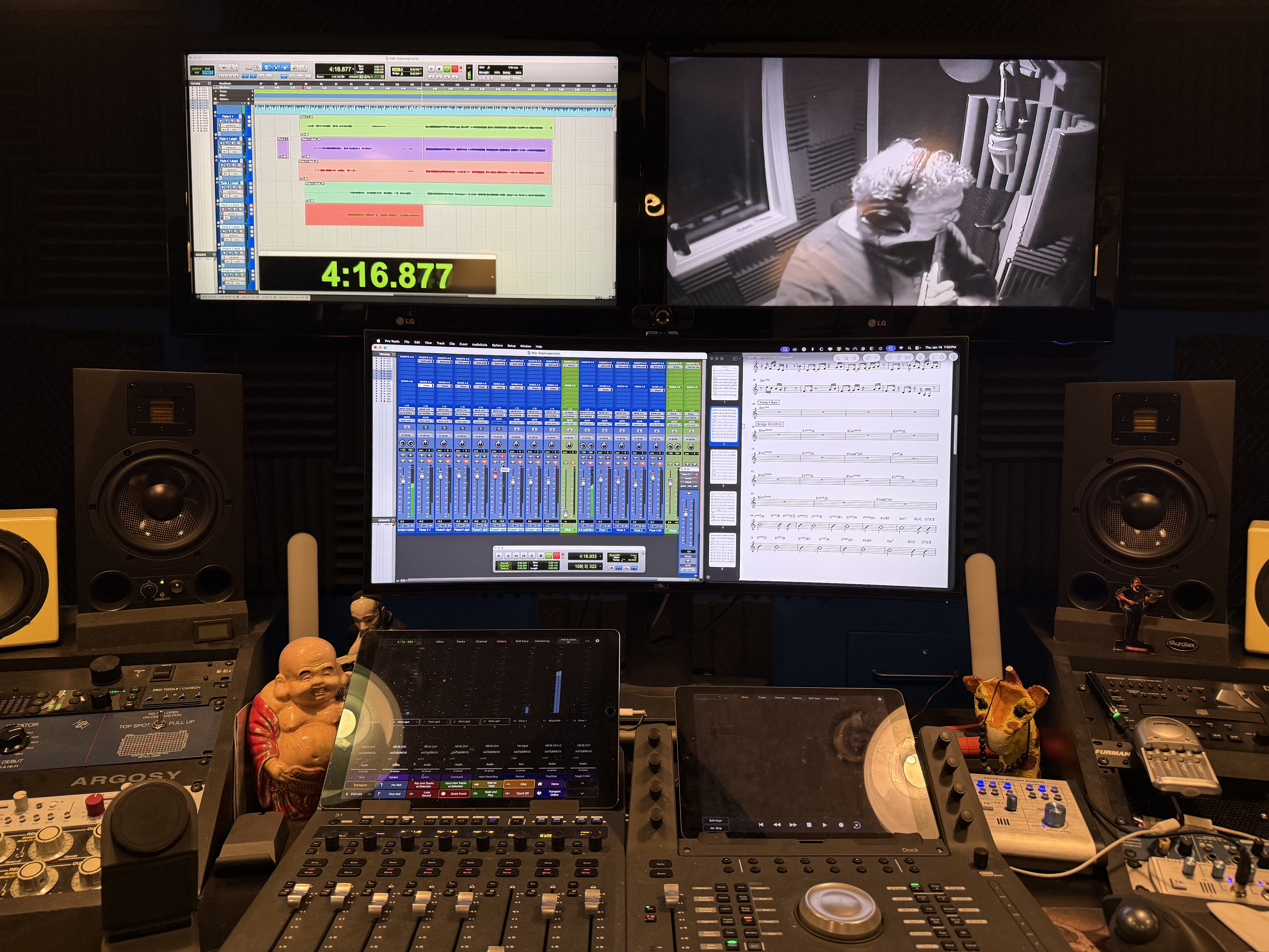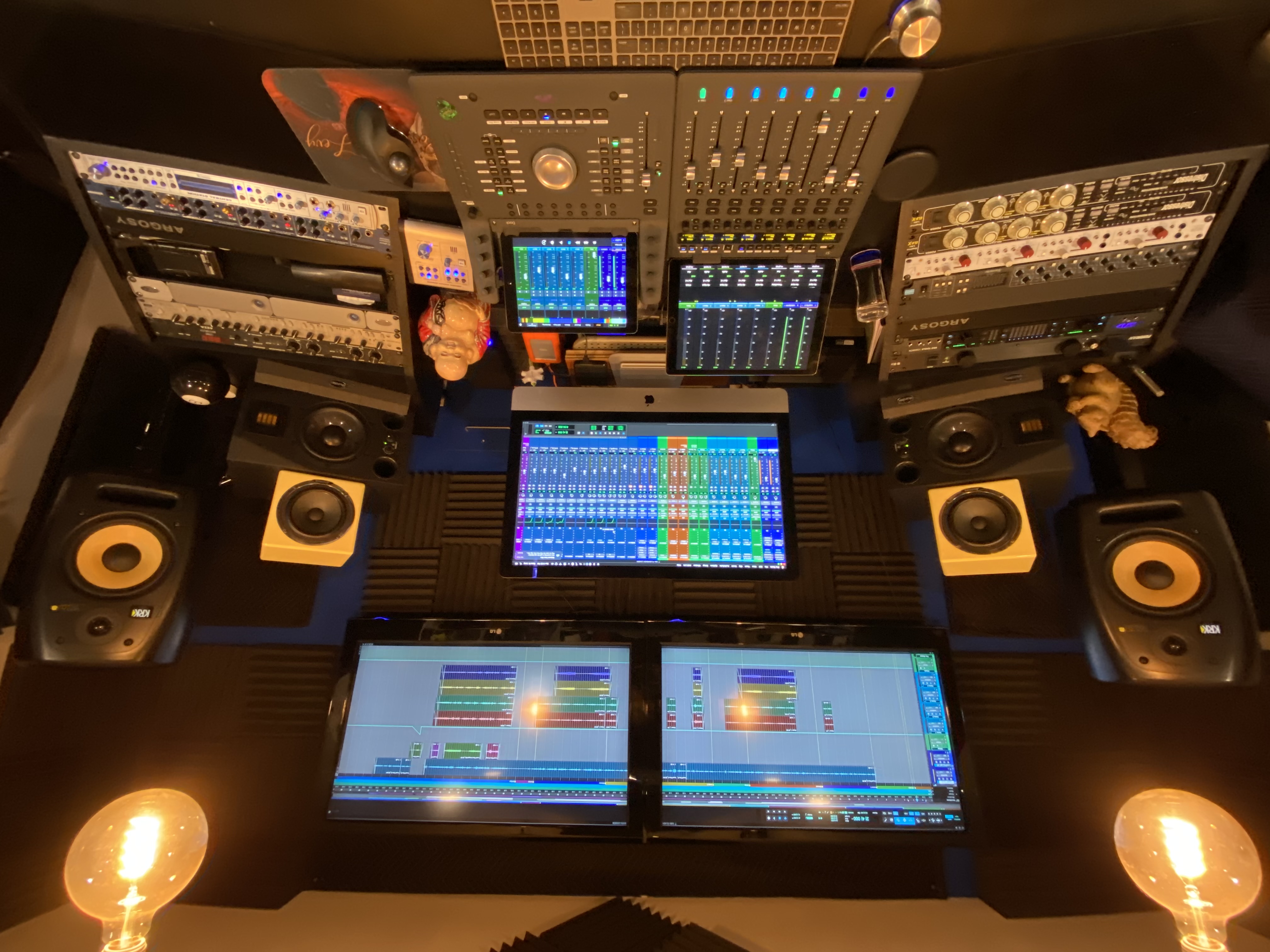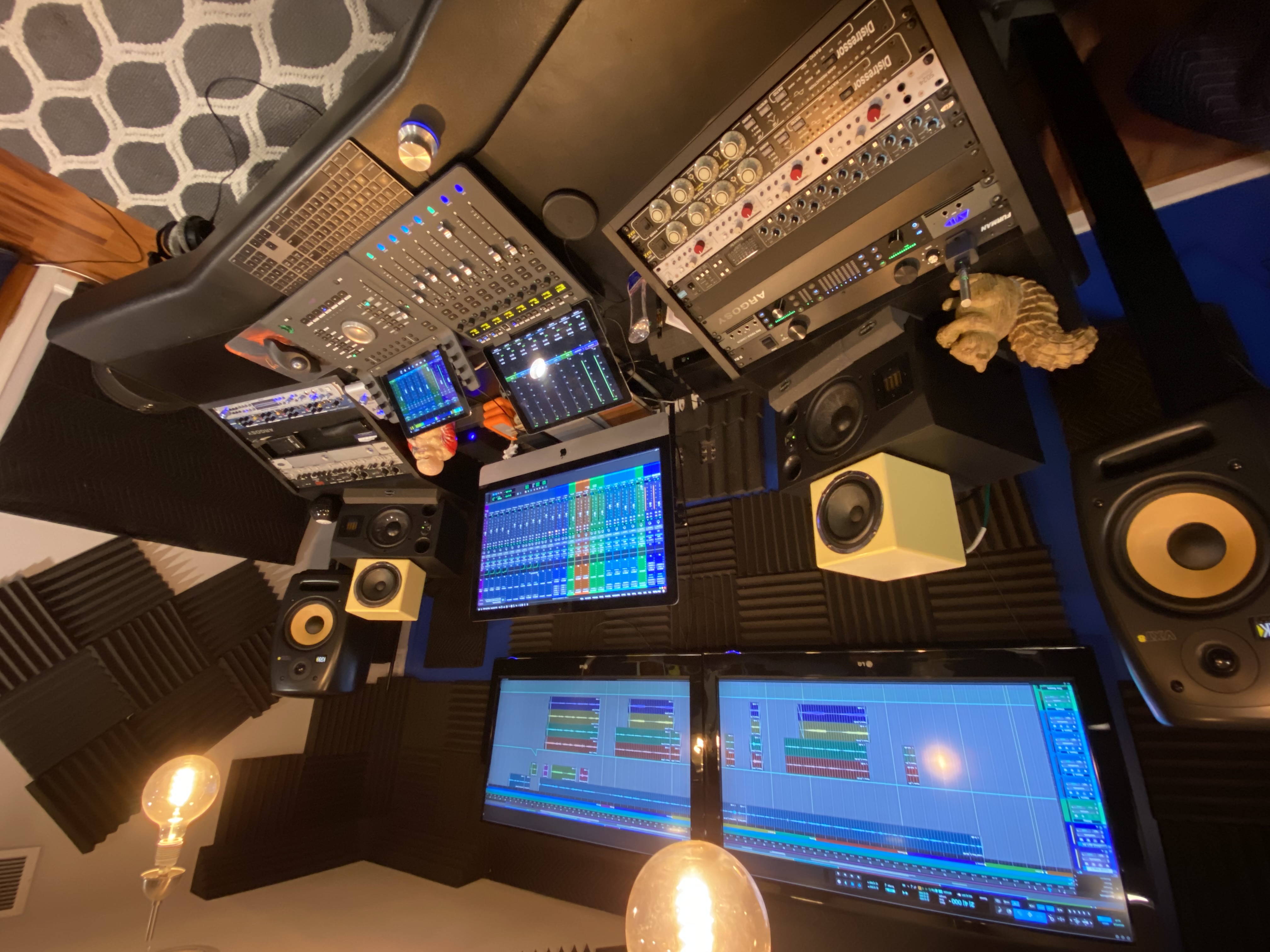 We record with Avid Pro Tools 12, and our extensive mic and preamp collection (Neve Portico, Focusrite, Telefunken) ensures a full, rich sound monitored through Adam AX7 and KRK VXT 8 speakers.