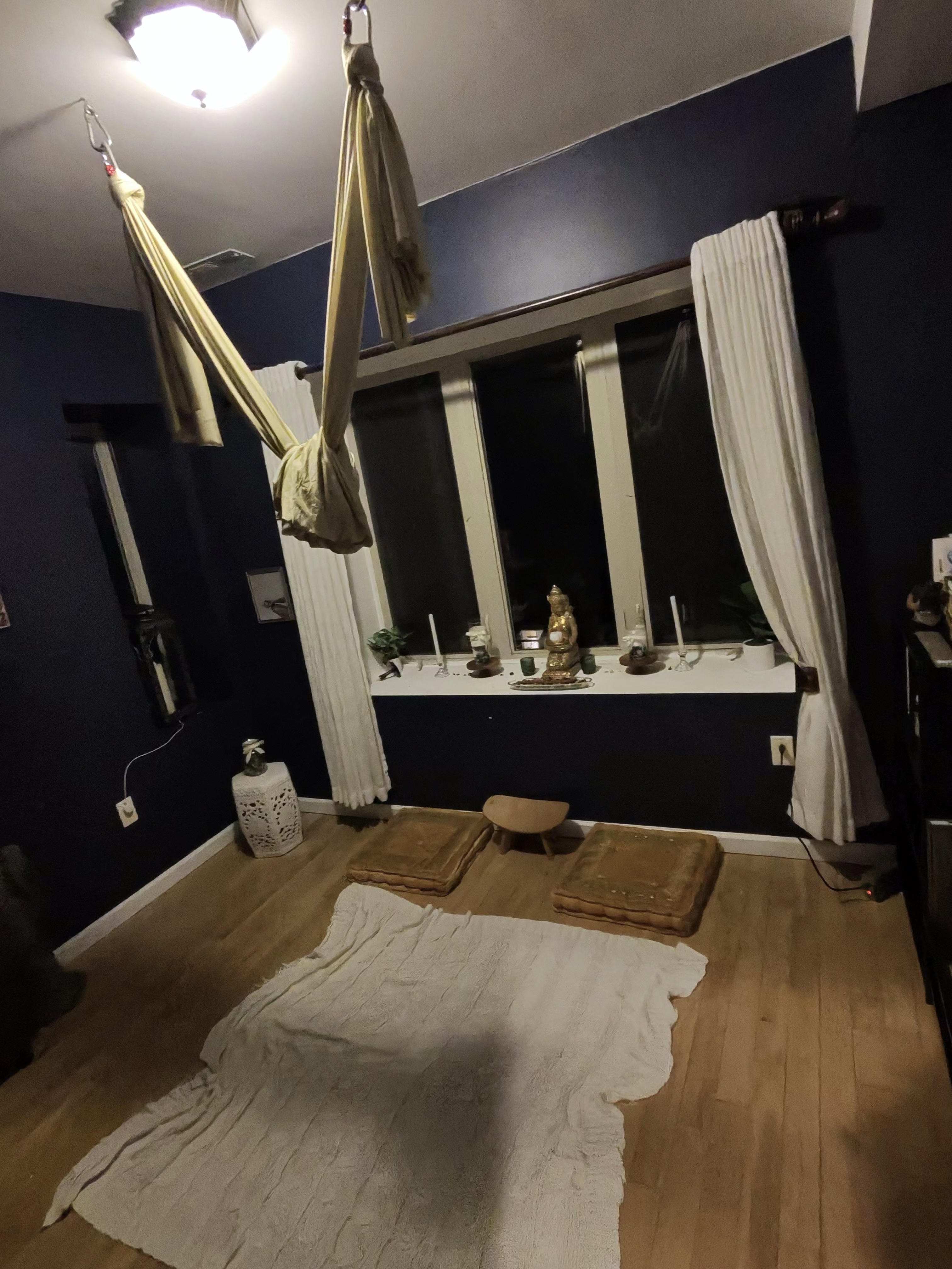 Painted a rich, deep, tranquil blue. A golden yoga swing hangs from the ceiling. Golden floor pillows, yoga mats, a wind chime. Shelves bridge Torah and Talmud with yoga practice and Tibetan meditation traditions.